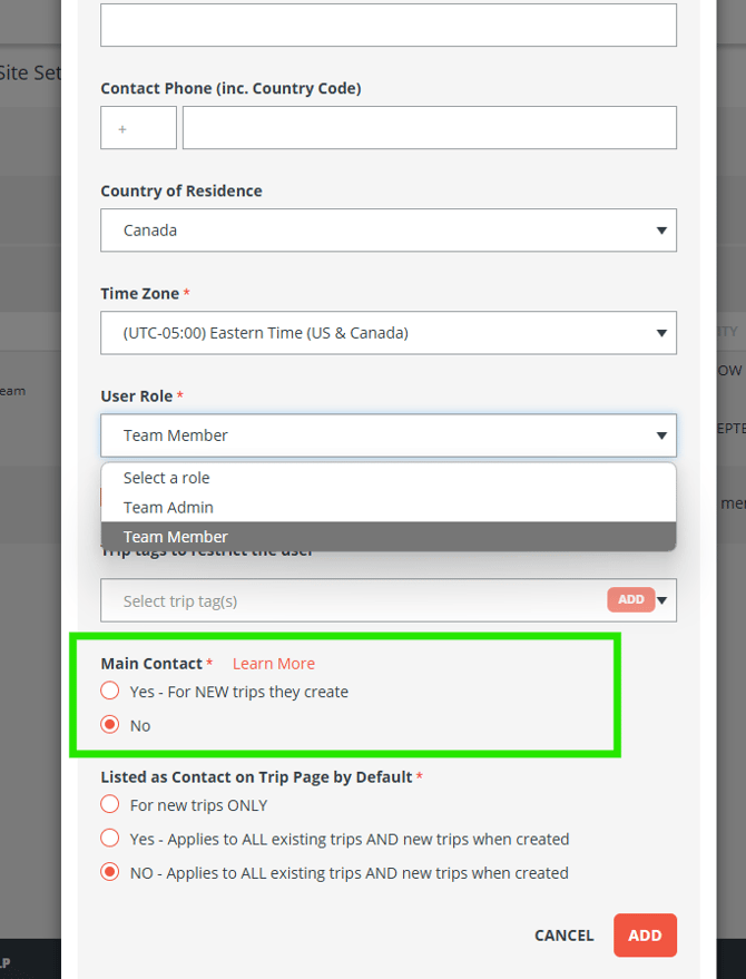 - The Trip Owner is automatically designated as the Main Contact for a Trip, however, the main contact can be changed to another member of the Team.