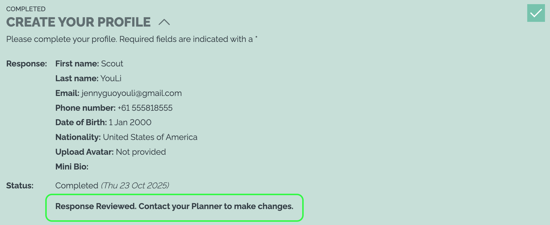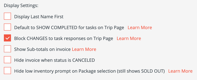 If you enable "Block CHANGES to task responses on the Trip Page" under Account > Site Settings, then after you complete the review, travelers won’t be able to change their responses unless they contact you directly.