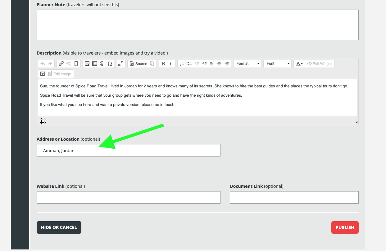 - "Don't show on TripPage Map" - Decide whether or not you would like this item to appear on your TRIP PAGE MAP