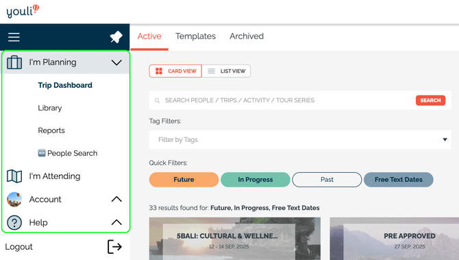 - I'M PLANNING: If you are a TRIP Planner, this is where you will spend most of your time. This is where all the Trips you create will live. You can also access your TRIP DASHBOARD and use the ACTIVITY SEARCH to search activity across all Trips