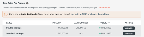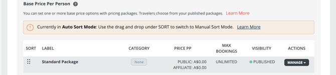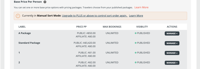 Packages sort automatically based on price, but this can be overridden with a manual sort order per Trip.