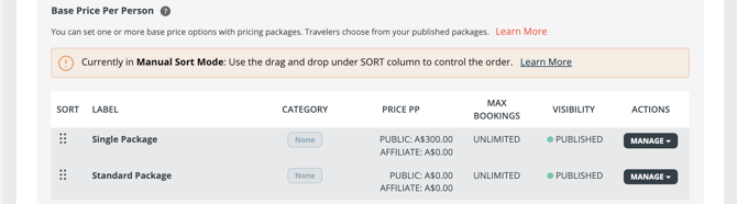 For Planners with access to Manual Sort Mode, they can override the Auto Sort by dragging and dropping the packages in the table under PRICING.
