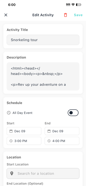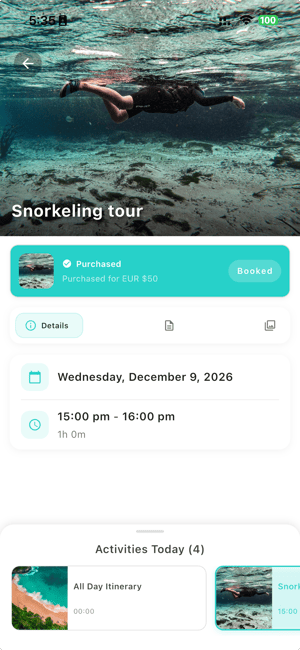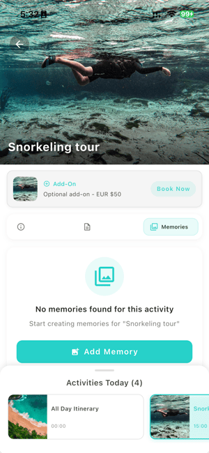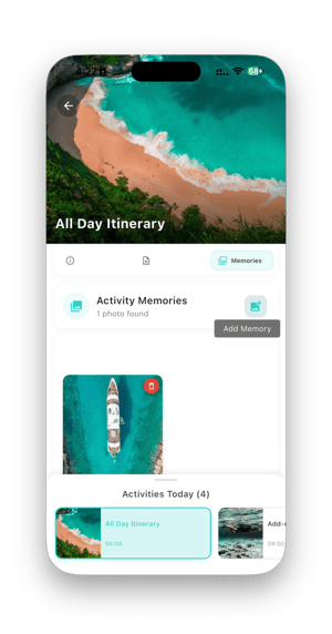 Only displays each itinerary's start time (if available) or "All Day" along with the title. When clicked, it shows the details, including the Details, Overview, Memories- Memories: Photos stitched into the itinerary by activity — not just a camera roll blur. Travelers share and comment on photos together, creating tangible memories tied to moments.