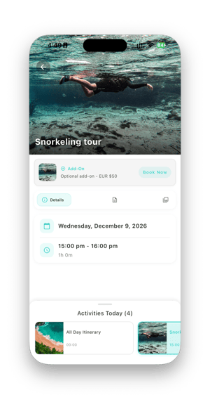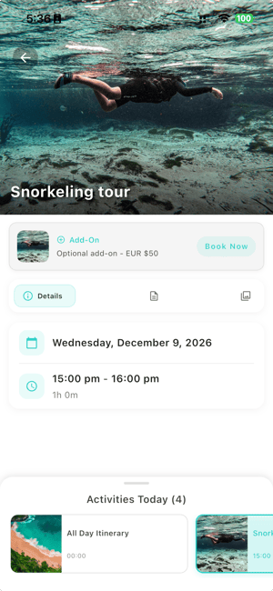 If an itinerary item is an add-on or optional item, it includes a call-to-action box. Travelers can click the call-to-action box to open the itinerary page and change their selection. When the item is booked, the button will display "Booked"; otherwise, it will display "Book Now".