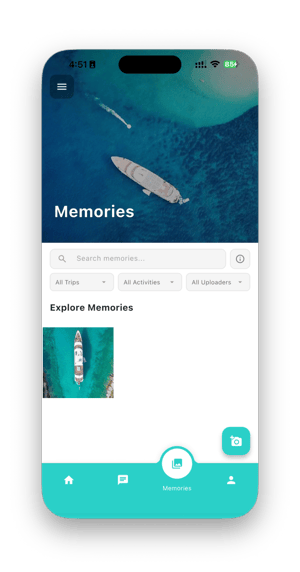 All memories uploaded to the trips the traveler has attended will appear here. You can filter them by Trip, Itineraries, and Uploaders.