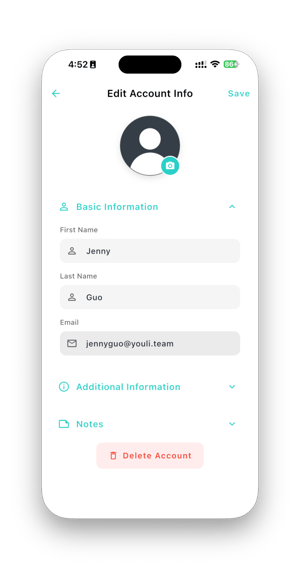 This page displays basic personal information, including avatar, name, email, and phone number pulled from YouLi.