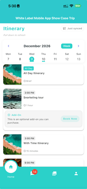 Itinerary calendar are using weekly view. The dots under the date indicate how many itineraries are under that date.You can choose to set the default view to Weekly, 2 Weeks, or Month view — or fix it to a specific view when setting up your WLA.