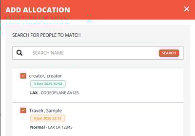 - You can purchase a role that can only "ALLOCATE PEOPLE" (green button) and in the popup window: search, select Traveler names and "ALLOCATE" (red button) them into to the transfer